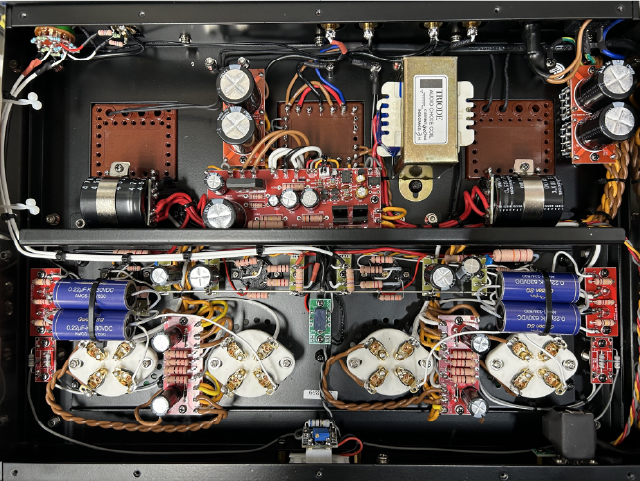 直熱三極管の魅力を損うことなく引き出しながら、様々なスピーカーのドライブに十分な出力が得られるA級パラシングルの回路構成で20W+20W(8Ω)を確保しています。